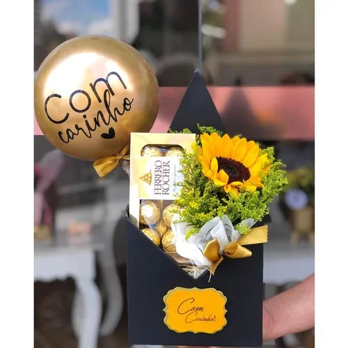 – 01 Caixa Carta Preta- 01 Arranjo de Girassol- 01 Caixa com 08 unidades de Ferrero Rocher- 01 Mini Balão Dourado Personalizado (Com Carinho)