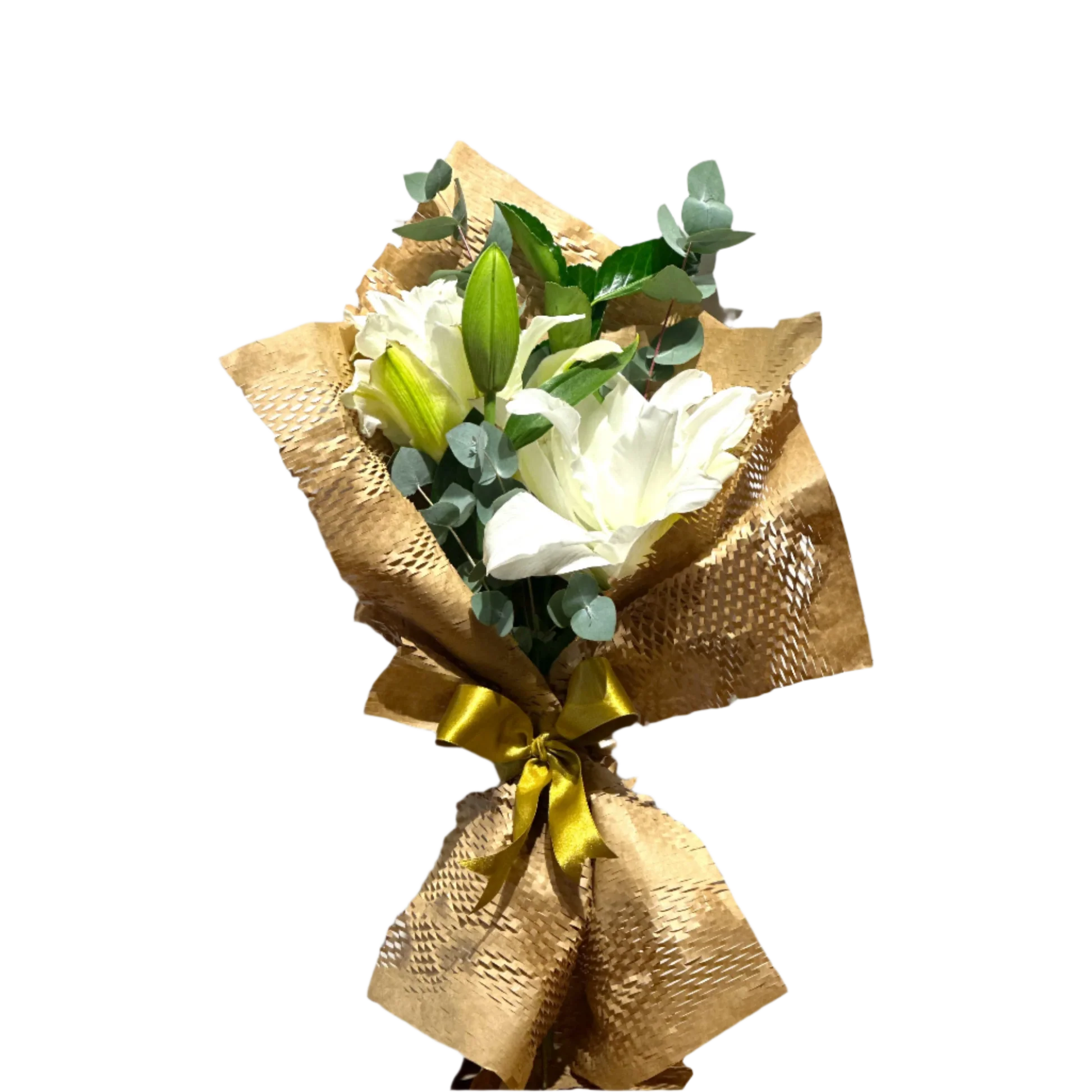 Este buquê deslumbrante de lírios brancos, complementado com folhas de eucalipto e um laço dourado, simboliza pureza e sofisticação. Perfeito para ocasiões especiais, transmitindo serenidade e beleza atemporal.