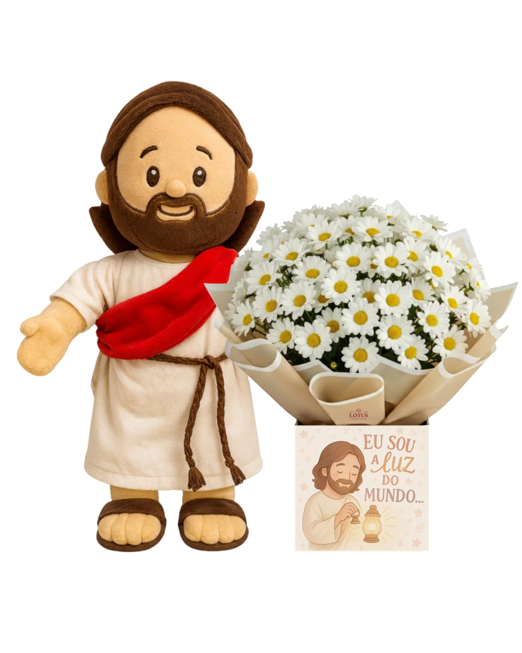 Um presente para trazer calma, conforto e aquela presença que acolhe. As flores brancas representam paz e esperança, e a pelúcia de Jesus transmite amor e cuidado em forma de abraço.